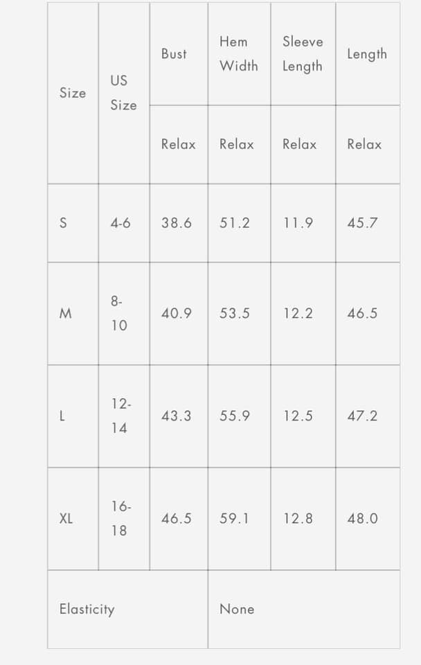 Size chart is listed for reference.